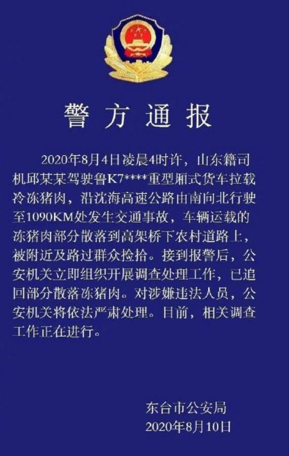 此前据报道称,一辆货车在江苏东台市境内遭遇车祸,车辆所载猪肉引发部分当地群众哄抢。据东台市公安局8月10日的通报,驾驶员为山东籍司机邱某某,其于8月4日凌晨4时许在沈海高速发生交通事故,车辆运载的冻猪肉部分散落在高架下道路上,被附近及路过群众捡拾。