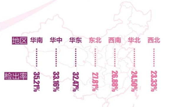 华南、华中和华东地区的乳腺彩超(除乳腺增生外)异常指标检出率较高,可能是这些地区经济水平较高,女性生活节奏快、职场压力大,饮食习惯改变、哺乳期较短、环境污染等多种原因导致出现较高的乳腺异常检出率。而华北和西北地区女性乳腺彩超(除乳腺增生外)异常检出率相对较低,可能与该地区饮食习惯相对健康等因素有关。
