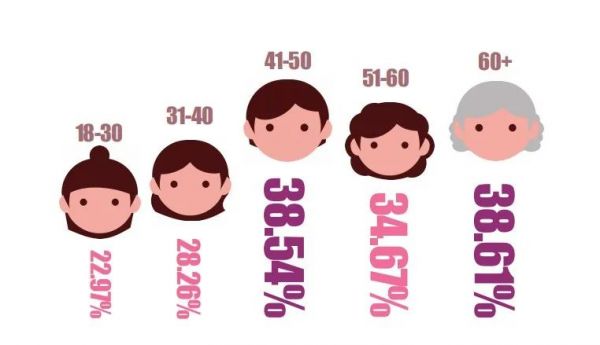 报告发现,乳腺彩超(除乳腺增生外)各年龄组均呈现较高的异常检出率。30岁以后异常检出率明显增高,从40岁开始,异常检出率超过30%,41岁~50岁和60岁以上女性人群异常检出率最高,均接近40%。建议每年进行一次乳腺检查,提高对乳腺健康的自我保健意识,识别乳腺疾病的早期信号,减少乳腺疾病的发生。