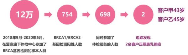 2018年9月-2020年6月,近12万爱康集团体检客户(以下简称“客户”)参加了BRCA遗传性乳腺癌、卵巢癌基因检测。754位客户的BRCA1/BRCA2基因的检测结果呈阳性。将754位客户与其在爱康集团的最后一次体检数据和历次体检数据进行匹配,匹配到698位客户的体检数据。在698位客户中,爱康集团已经根据体检结果和基因检测结果追踪到2位客户确诊为乳腺癌。