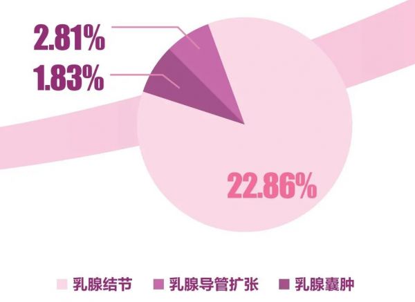 通过对从2019年7月至2020年6月在爱康集团旗下体检中心参加乳腺检查的2,297,532名成年女性进行分析(年龄以18岁~40岁女性为主),乳腺异常整体检出率为26.82%。乳腺彩超(除乳腺增生外)异常指标主要包括:乳腺结节、乳腺导管扩张、乳腺囊肿等多个指标,其中乳腺结节占22.86%。