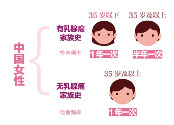 爱康集团建议:中国女性应提前13-15年,从35岁开始每年做一次乳腺癌的筛查。如果年龄>35岁,且有乳腺癌家族史女性,建议缩短到半年一次。如有BRCA基因突变的女性,需要从20岁开始定期筛查。