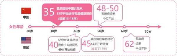 美国乳腺癌诊断中位年龄为62岁,美国癌症学会建议提前17年,从45岁开始进行乳腺癌的筛查,而美国著名的肿瘤医院纽约纪念斯隆·凯特琳癌症中心建议提前22年,从40岁开始就进行乳腺癌的筛查。中国乳腺癌诊断中位年龄为48岁-50岁,定期进行体检、健康检查是早期发现乳腺疾病的重要措施。